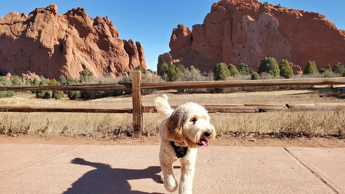 I am a mini F1B Goldendoodle. That means I am 75% poodle and 25% golden retriever and I weigh about 45 pounds. I hardly shed at all, I am very friendly, and very smart, I can even open doors! You can learn more about my dog-mom and dog-dad here.